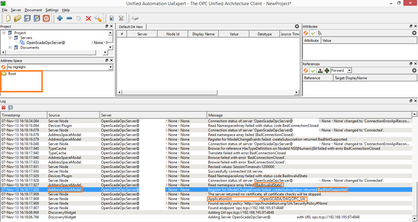 В логах UAExpert имеются ошибки (выделил цветом).