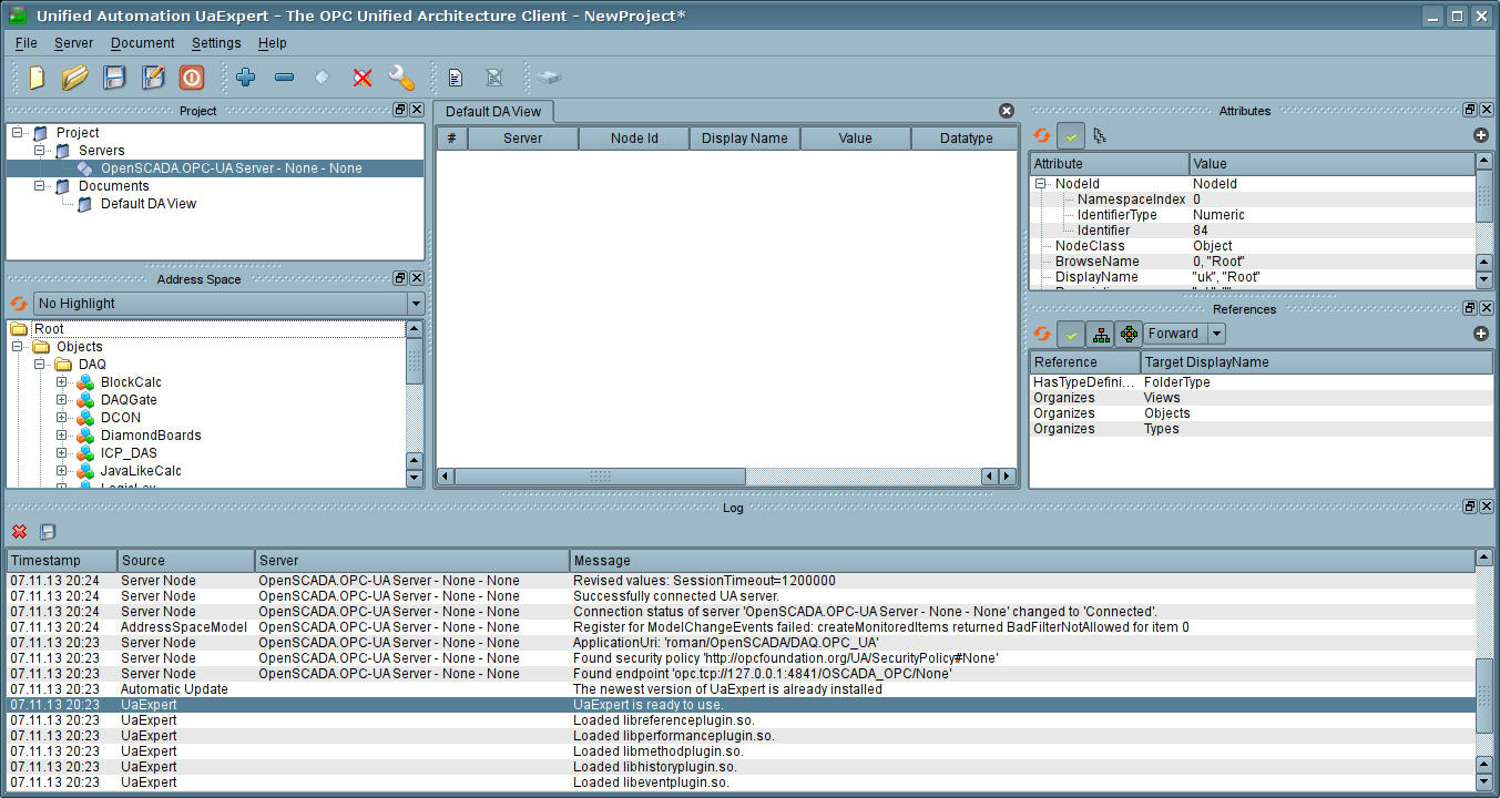 Использую UAExpert Version:1.2.2 175 и OpenSCADA 0.8.1 и OPC_UA 0.6.2